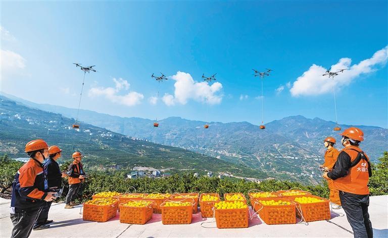 11月5日,湖北省宜昌市秭歸縣郭家壩鎮熊家嶺村果園,技術人員在試驗使用無人機轉運臍橙。 鄭家裕攝(中經視覺)