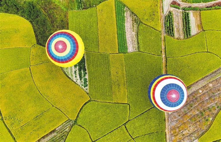 湖南省永州市寧遠縣灣井鎮,游客體驗在熱氣球上觀賞田園美景。 蔣克青攝(中經視覺)