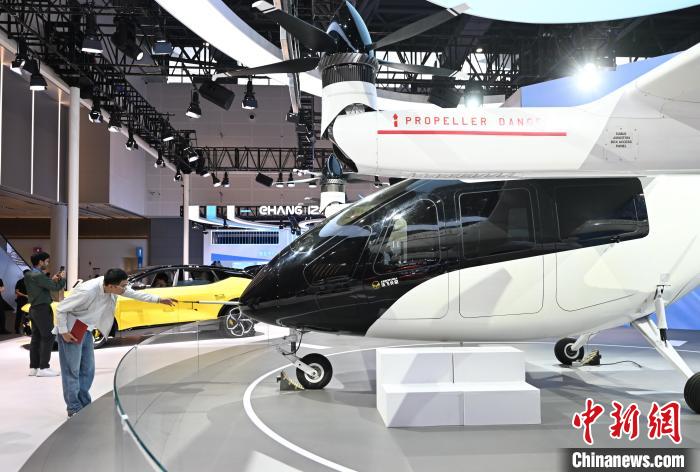 9月26日,浙江杭州,電動無人駕駛載人航空器引人觀看。當日,在第三屆全球數貿會展覽現場,多款高科技飛行器設備亮相,吸引參觀者。中新社記者 王剛 攝