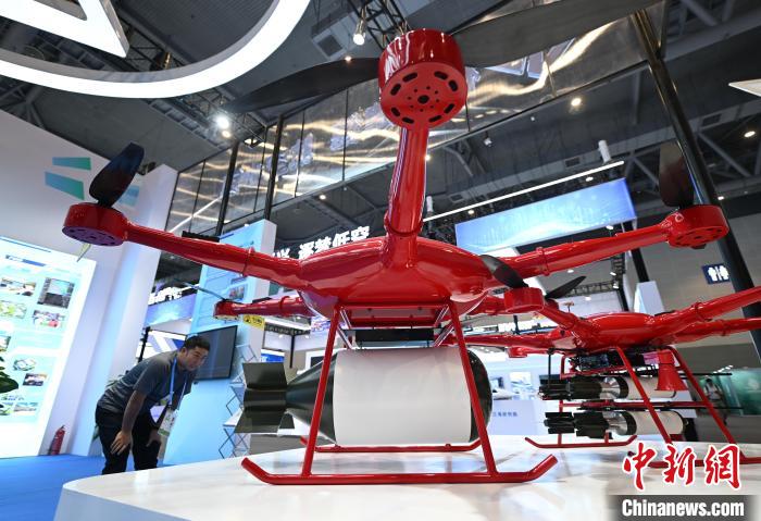 9月26日,浙江杭州,系留式消防無人機引人關注。當日,在第三屆全球數貿會展覽現場,多款高科技飛行器設備亮相,吸引參觀者。中新社記者 王剛 攝