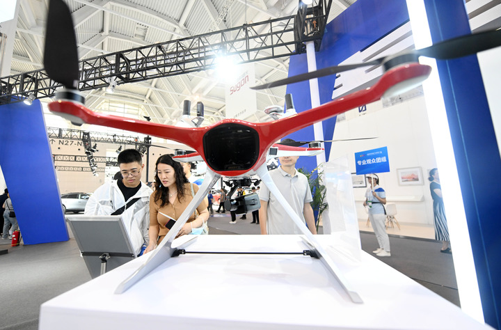 6月21日,參觀(guān)者在博覽會(huì)低空經(jīng)濟(jì)展團(tuán)參觀(guān)一款無(wú)人機(jī)。新華社記者 趙子碩 攝