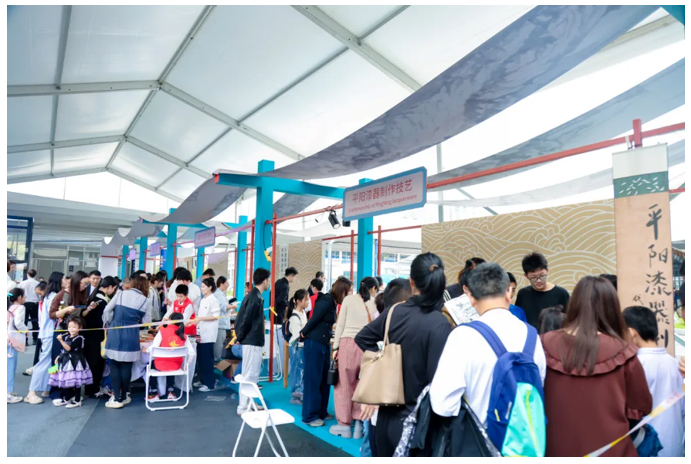 而在平陽漆器制作技藝展臺(tái)前,非遺老師將一把白色團(tuán)扇浸入調(diào)好漆的水缸里,浸潤(rùn)、翻轉(zhuǎn),僅僅十秒鐘,扇面就成了寫意十足的國(guó)風(fēng)畫,惹得在場(chǎng)人直呼神奇。