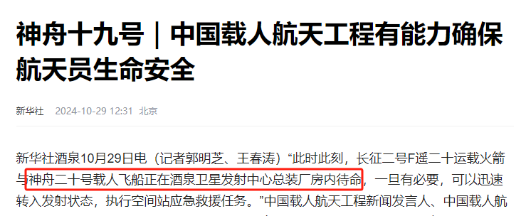 這次神十九發射升空后,其備份神舟二十號飛船就一直在地面上整裝待命。