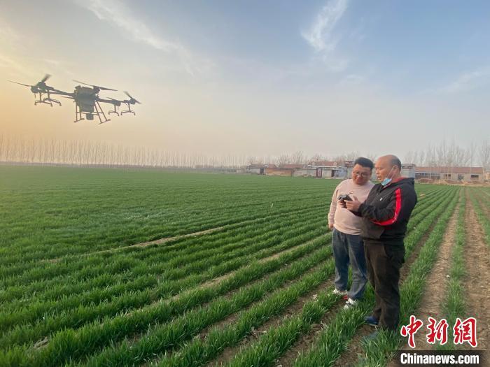 2024年3月,在寧陽縣堽城鎮的一處麥田,薛鵬舉指導機手操作無人機。 (資料圖) 寧陽縣委宣傳部供圖