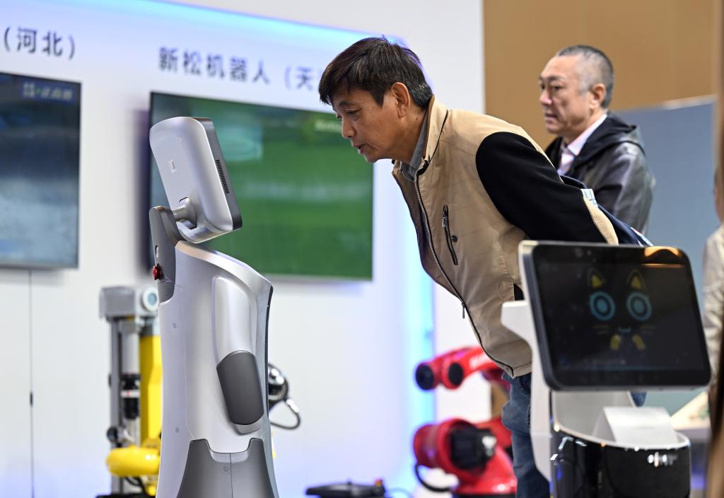“更令人欣慰的是,這些供應商大多都走上了國際化道路,成為業界的共享資源,和友商一道推動了行業的技術進步和高質量發展。”陳和強說。10月25日,在2024京津冀產業鏈供應鏈大會開幕式會場外設置的企業推介展區,與會嘉賓與一款服務機器人互動。新華社記者 趙子碩 攝