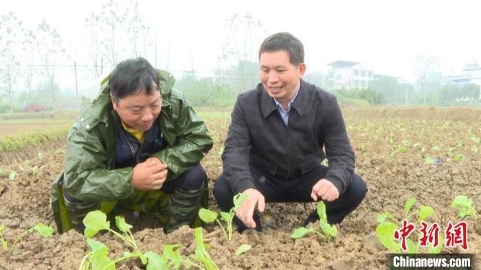 祁陽市農業農村局高級農藝師易愛民仔細查看村民種好的油菜田。他介紹,育苗移栽的油菜,要比撒播種植的油菜每畝可減少油菜籽用種量,同時可以提前形成豐產苗架,增加分枝數量,每畝要多收100多斤油籽。