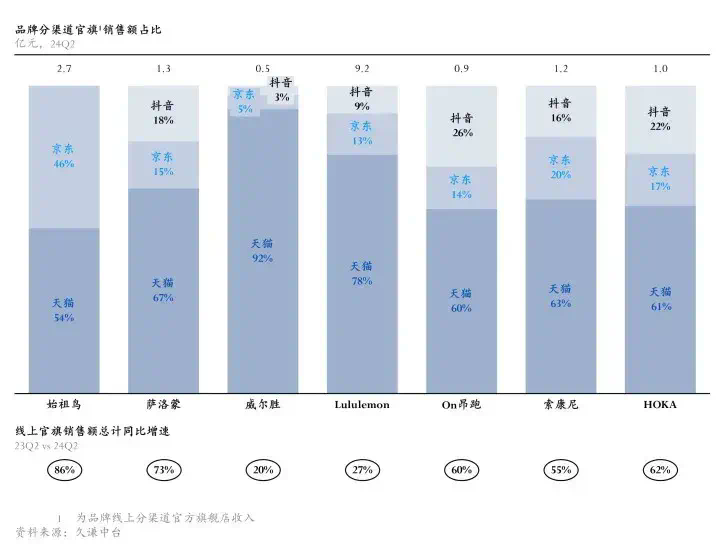 今年9月,久謙中臺(tái)發(fā)布中產(chǎn)運(yùn)動(dòng)戶外品牌研究報(bào)告,天貓旗艦店已成品牌的主要銷售渠道和經(jīng)營(yíng)陣地,貢獻(xiàn)了中產(chǎn)新貴品牌線上超50%的銷售額。