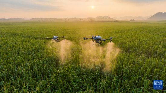 大疆農(nóng)業(yè)無人機(jī)T60(右)與T25P在田間作業(yè)(資料照片)。新華社發(fā)