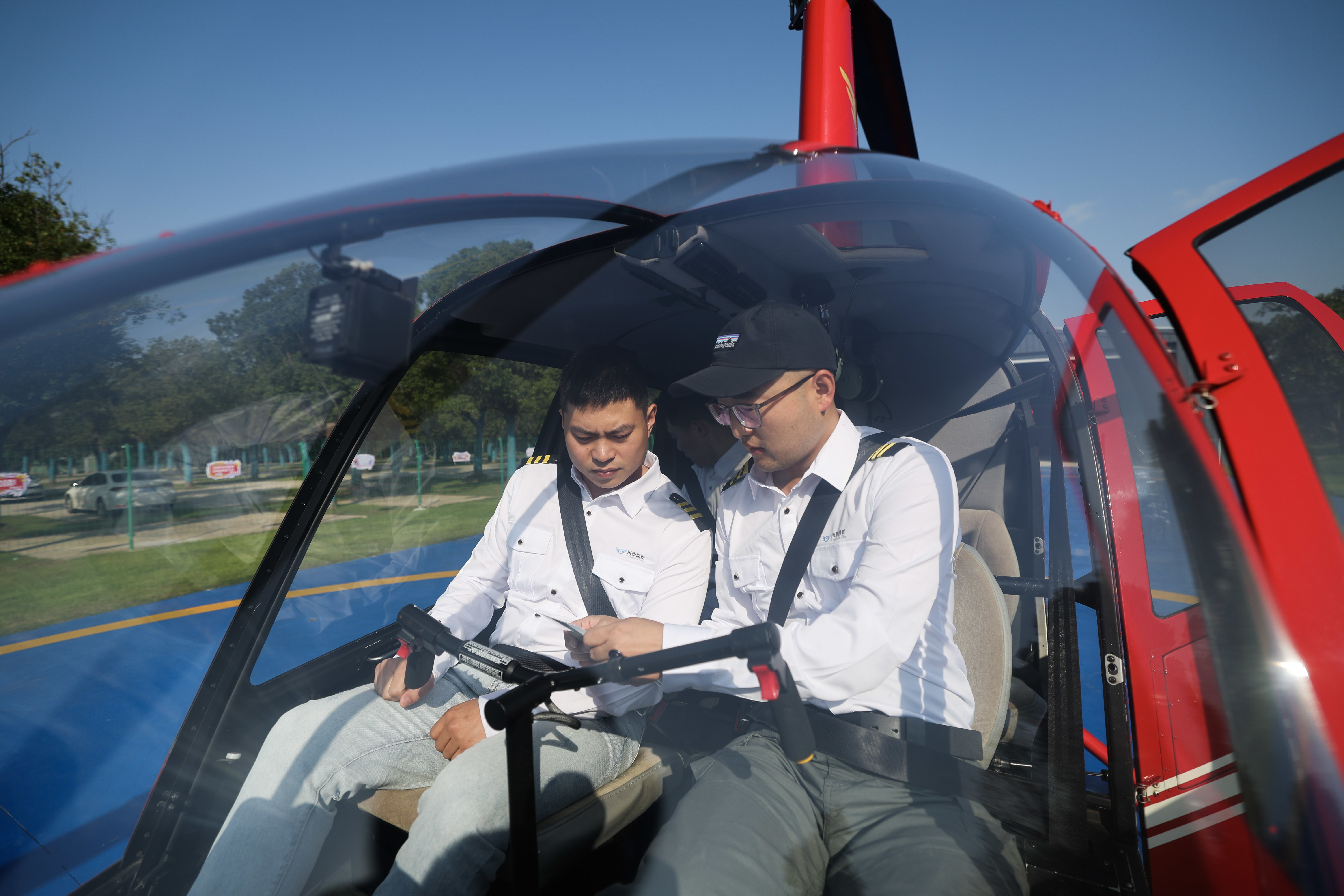 11月5日,在湖州米旗通航直升機飛行基地,飛行教員(右一)帶領學員進行日常培訓。新華社記者 徐昱 攝