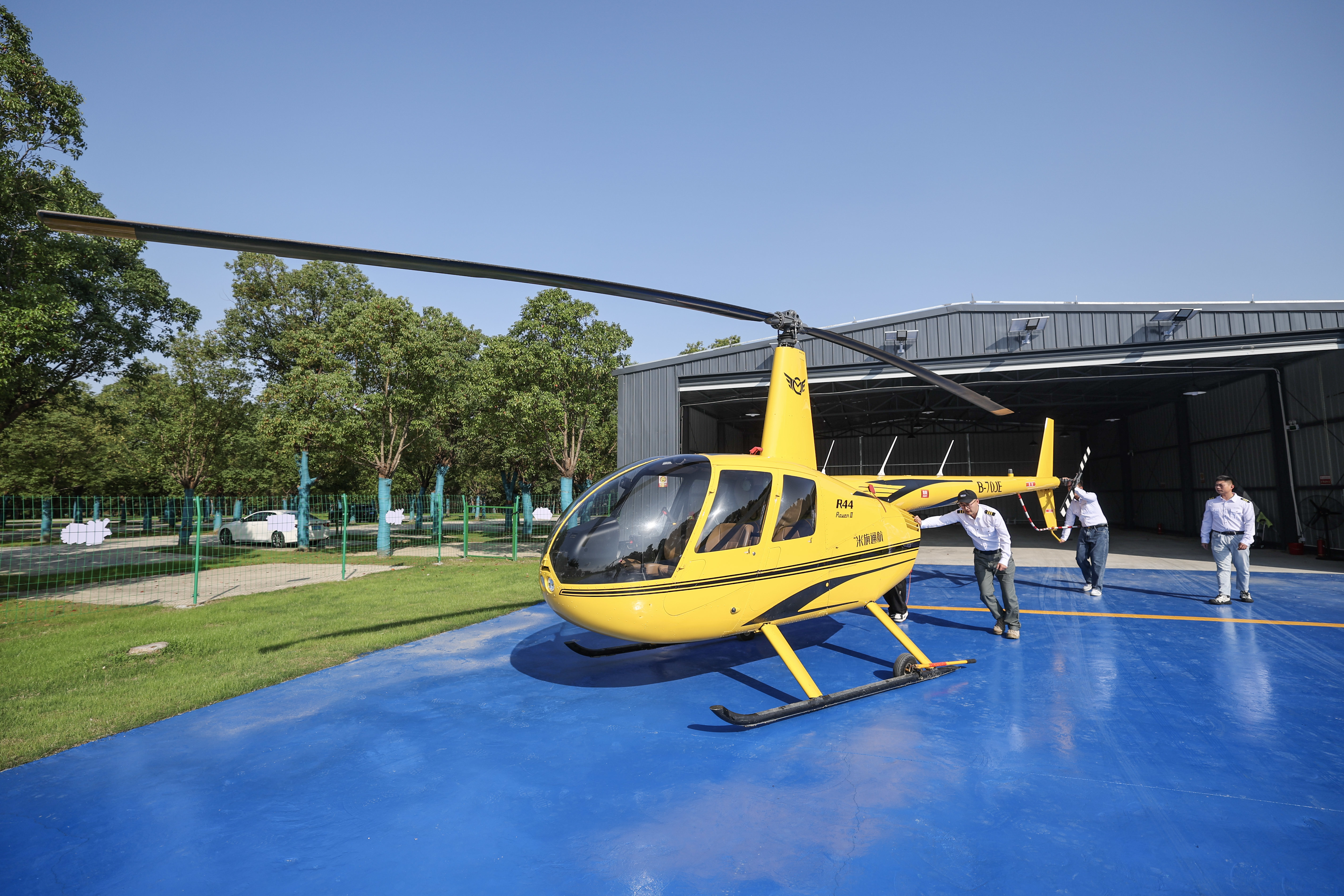 11月5日,在湖州米旗通航直升機飛行基地,飛行教員帶領學員把直升機推出機庫,準備進行日常培訓。新華社記者 徐昱 攝