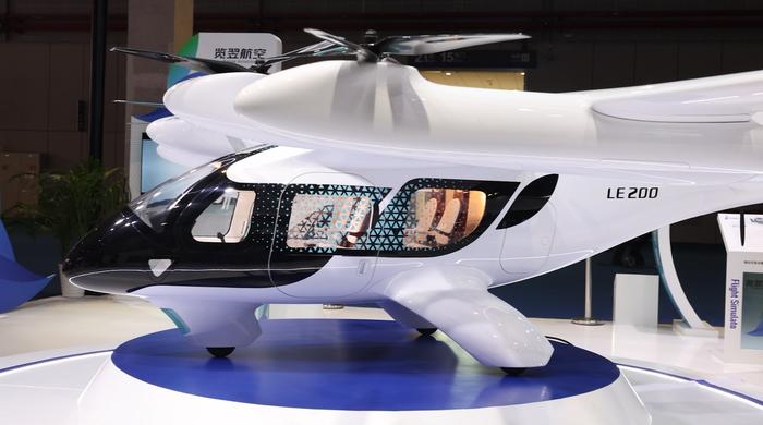 相比其他三家,覽翌航空是進博會展示現場最年輕的一家低空經濟企業,成立于2023年5月,總部位于合肥,上海設有研發中心。覽翌航空本次展出兩款機型,一款為電動垂起客運eVTOL,型號名LE200,最大起飛重量2600kg,航程140-320km,航速200km/h,可載客2-5人,該機型于2023年9月完成縮比驗證機的研制及試飛,目前正在研制全尺寸工程樣機。另一款為中型電動垂起物流無人機,型號名LEU100。