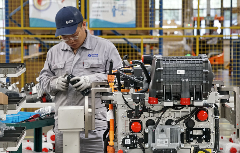 圖為在北京大興國際氫能示范區內,一家生產氫能燃料電池發動機企業的員工在裝配設備。新華社記者 李欣 攝