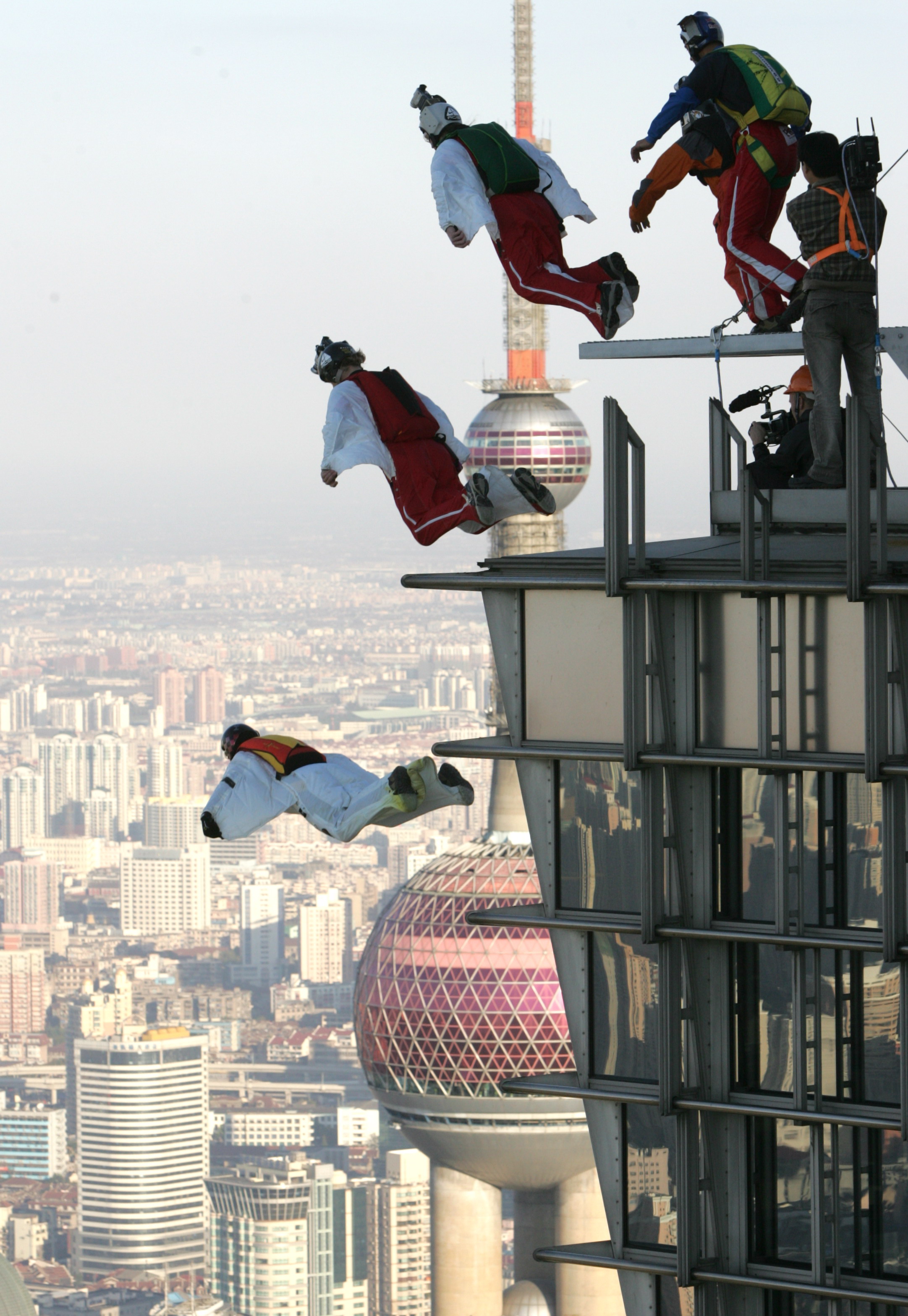 2003年10月6日,“中華第一高樓”金茂大廈88層平臺(tái)上,低空跳傘運(yùn)動(dòng)員依次跳下。王杰 攝