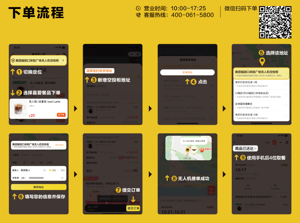 美團(tuán)無人機(jī)與微信港幣錢包(WeChat Pay HK) 攜手合作,航線支持異地下單及港幣支付的模式,從香港北上路途中,還沒到深圳就可修改收貨地址,先人一步點(diǎn)空投外賣,記得外賣地址認(rèn)準(zhǔn)“美團(tuán)福田口岸前廣場無人機(jī)空投柜”喔。