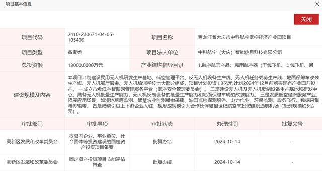 黑龍江投資項(xiàng)目在線(xiàn)審批監(jiān)管平臺(tái)顯示,大慶市中科航宇低空經(jīng)濟(jì)產(chǎn)業(yè)園項(xiàng)目備案通過(guò)。該項(xiàng)目計(jì)劃建設(shè)民用無(wú)人機(jī)研發(fā)生產(chǎn)基地、低空管理平臺(tái)、反無(wú)人機(jī)設(shè)備生產(chǎn)線(xiàn)、無(wú)人機(jī)任務(wù)載荷生產(chǎn)線(xiàn)、地面保障車(chē)改裝生產(chǎn)線(xiàn)、無(wú)人機(jī)展廳展會(huì)、無(wú)人機(jī)培訓(xùn)學(xué)校七大部分組成,項(xiàng)目計(jì)劃投資1.3億元。