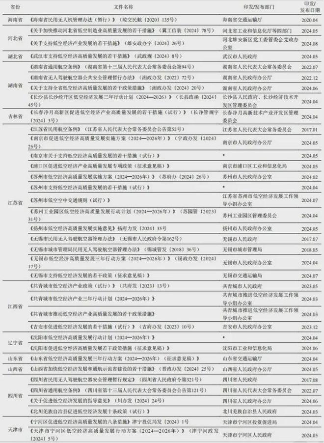 在地方性法規與規范性文件方面,各地政府積極響應國家號召,紛紛出臺了一系列促進低空經濟高質量發展的政策措施。例如,北京市、天津市、河北省、安徽省、江蘇省、浙江省、廣東省等地均發布了相關行動方案或若干措施,旨在推動低空經濟的產業發展、基礎設施建設、安全保障以及政策支持與激勵。以下為全國各省份低空經濟地方政策法律文件的匯總如表1所示: