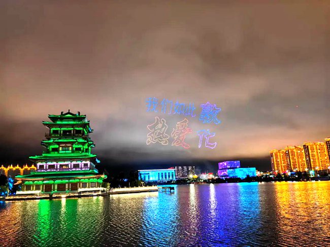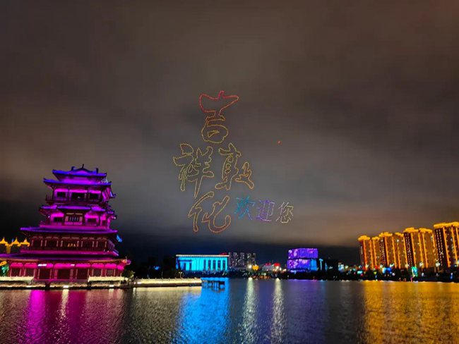 尤為震撼的是,千架無人機在夜幕中騰空而起,以夜空為幕,通過精準的編隊和絢麗的燈光變化,呈現出一系列美輪美奐的圖案和文字表演,展示出敦化獨特的地域文化和城市魅力。一幅幅絢麗多彩的畫面,宛如一場奇幻的光影盛宴。“吉祥敦化歡迎您”向喜歡敦化的朋友們傳遞著敦化的友好與包容,“全民健身 全民健康”倡導全民積極參與健身、健康活動,“中華民族一家親,同心共筑中國夢”表達了敦化人民對民族團結和國家繁榮的堅定信念,“中國優秀旅游城市”彰顯了敦化作為旅游勝地的獨特魅力和吸引力,“我們如此熱愛敦化”直抒胸臆地表達了敦化人民對家鄉的深厚情感和自豪之情,這份熱愛將激勵著大家為敦化的美好未來不懈奮斗。
