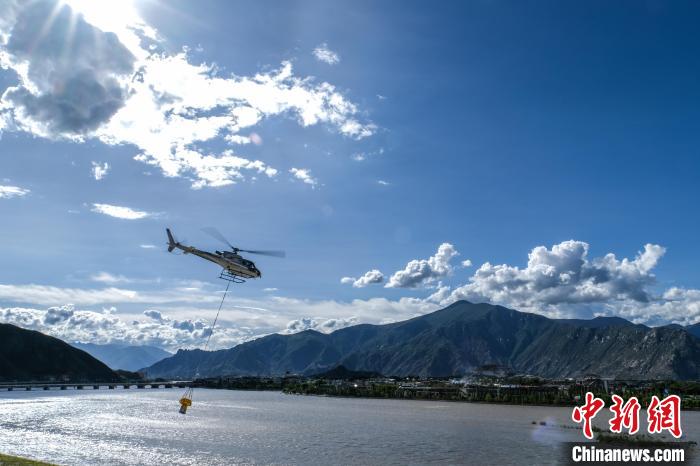 8月8日,空客H125直升機在拉薩進行吊桶灑水飛行演示。中新社記者 江飛波 攝