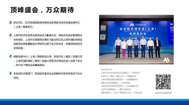 2025首屆國(guó)際低空博覽會(huì)新聞發(fā)布會(huì)在國(guó)家會(huì)展中心(上海)隆重舉行。主辦單位負(fù)責(zé)人出席了會(huì)議并介紹了博覽會(huì)的籌備情況.來自相關(guān)主管部門、低空經(jīng)濟(jì)重點(diǎn)企業(yè)和媒體代表共同參加了此次活動(dòng).