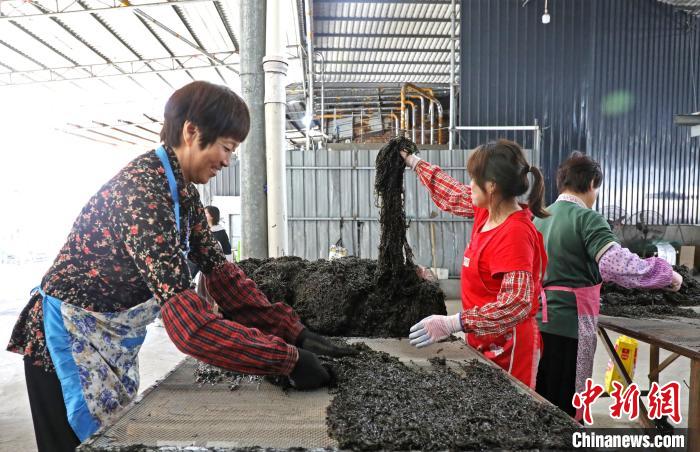 工人緊密協作,進行紫菜加工。夏巖緣 攝